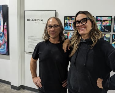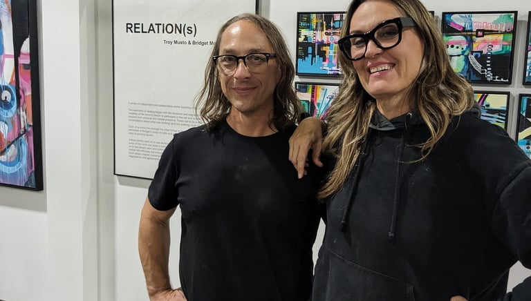 Each of us knows the strength the other brings to the table- Troy, though first intimidated, is admirable of Bridget’s sense of color and pattern where Bridget has always loved Troy’s fluid style of painting figures. Independently each of us was working through our own artist expressions and challenges- as some of this work was done in tandem.